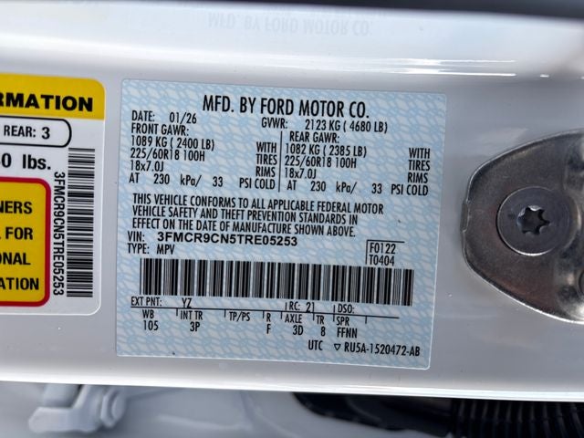4-Wheel Disc Brakes, ABS brakes, AM/FM Stereo, Apple CarPlay/Android Auto, Auto-dimming Rear-View mirror, Connected Navigation (1-Year Included), Delay-off headlights, Dual front impact airbags, Dual front side impact airbags, Electronic Stability Control, Emergency communication system: SYNC 4 911 Assist, Equipment Group 300A Standard Package, Ford Connectivity Package (1-Year Included), Front anti-roll bar, Front Bucket Seats, Front Driver/Passenger Seat Back Map Pockets, Front dual zone A/C, Front fog lights, Front Parking Sensors, Fully automatic headlights, Heated door mirrors, Heated front seats, Heated steering wheel, Internet access capable: 5G Modem - Ford Connectivity Package, Knee airbag, Low tire pressure warning, Memory seat, Occupant sensing airbag, Outer Banks Tech Package+, Overhead airbag, Power driver seat, Premium Trimmed Heated Front Sport Contour Bucket Seats, Radio: HD w/B&O Sound System by Bang & Olufsen, Rear anti-roll bar, Rear Parking Sensors, SiriusXM with 360L, SYNC 4 with Enhanced Voice Recognition, Variably intermittent wipers, Wheels: 18 Ebony Black. 2026 Ford Bronco Sport Outer Banks Oxford White 1.5L EcoBoost 8-Speed Automatic 4WD Factory MSRP: $39,335