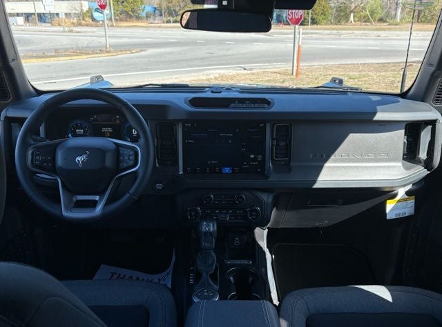2-Door Intelligent Access with Lock/Unlock, 4-Wheel Disc Brakes, 4.46 Axle Ratio, ABS brakes, AM/FM Stereo, Ambient Footwell Lighting, Auto High-Beam Headlamps, Auto High-beam Headlights, BLIS Blind Spot Information System, Cloth Bucket Seats, Connected Navigation, Delay-off headlights, Driver and Front Passenger Illuminated Sliding Visor Vanity Mirrors, Dual front impact airbags, Dual front side impact airbags, Dual Smart Charging USB Ports, Dual-Zone Electronic Automatic Temperature Control, Emergency communication system: 911 Assist, Equipment Group 222A Mid Package, Ford Connectivity Package (1-Year Included), Front anti-roll bar, Front Row Heated Seats, Front wheel independent suspension, Fully automatic headlights, Hard Top Sound Deadening Headliner, Heated door mirrors, Integrated roll-over protection, Low tire pressure warning, Occupant sensing airbag, Overhead airbag, Pro Power Onboard - 400W, Rear Parking Sensors, SiriusXM with 360L, SYNC 4, Wheels: 17 Carbonized Gray-Painted Aluminum. 2026 Ford Bronco Big Bend Shadow Black 2.3L EcoBoost I-4 10-Speed Automatic 4WD Factory MSRP: $48,615